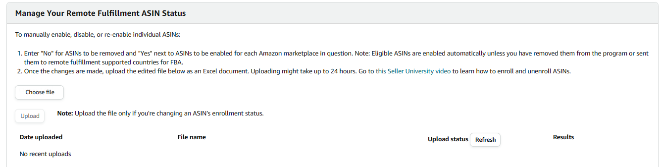 Note: After you enrol in Remote Fulfilment with FBA, it may take up to 24 hours to determine whether your ASIN is eligible.