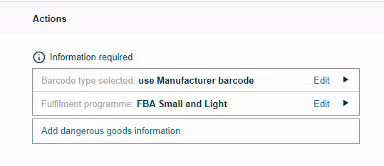 Fulfilled by Amazon (FBA): you will need to input the Barcode type selected, dangerous good information, and fulfilment programme (if applicable)