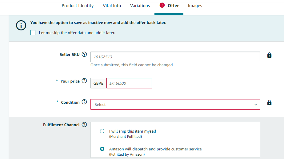Input the product SKU, price, condition and how you will fulfil the product